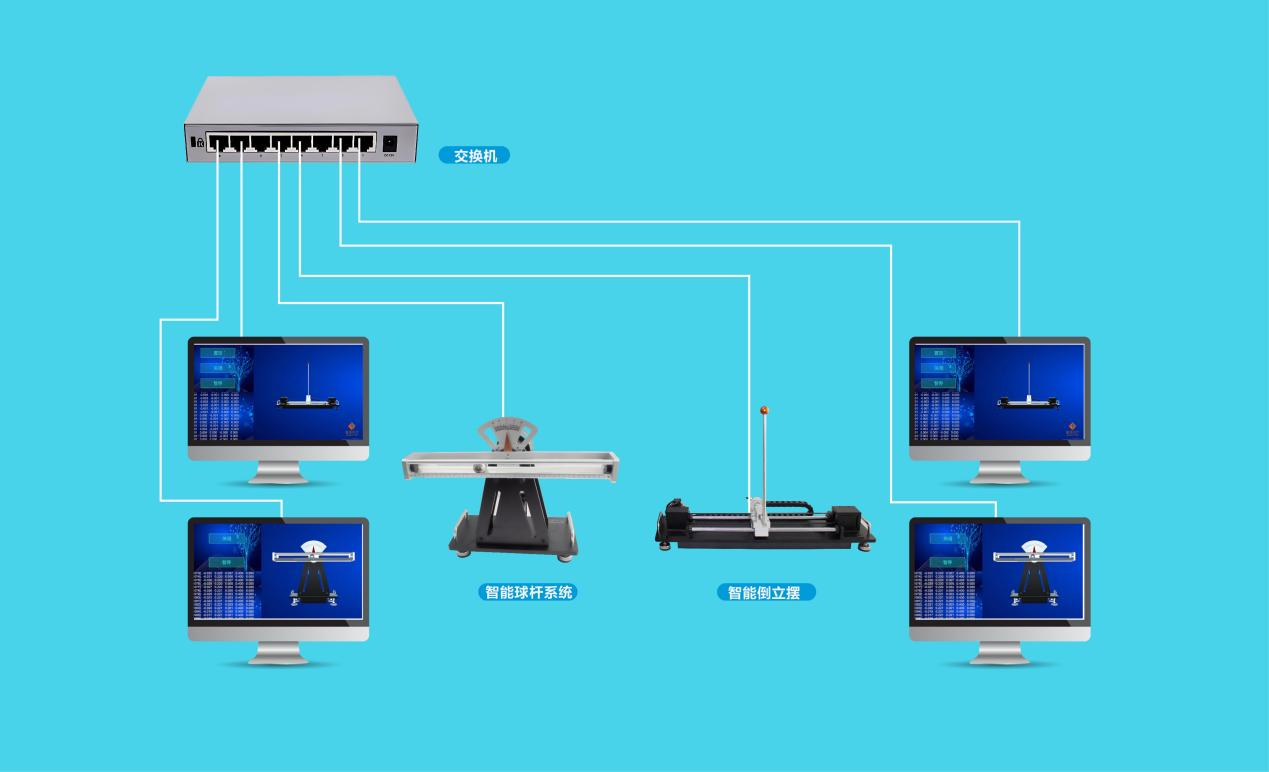 配套软件为基于孪生技术的智能倒立摆虚拟仿真实验软件、智能球杆系统虚拟仿真实验软件;配套设备为智能型倒立摆、智能球杆系统实物平台;另外配套网络设备若干。实践教学过程做到虚实结合,先虚后实,循序渐进;完成自动控制原理、现代控制理论、智能控制、人工智能等相关实践教学。